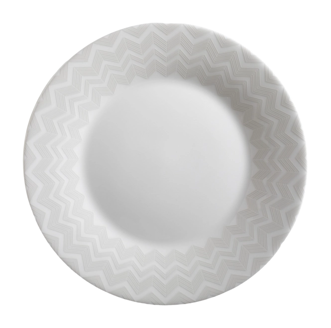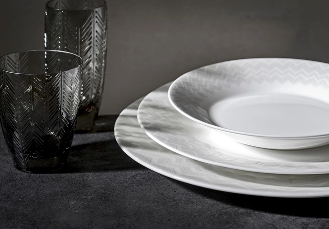 Hvite desserttallerken i glasert porselen med Missonis ikoniske zigzag-struktur.