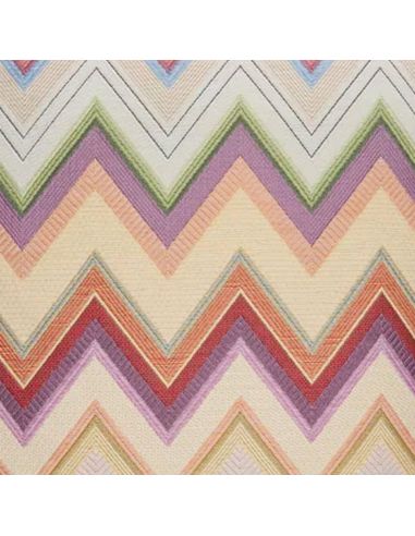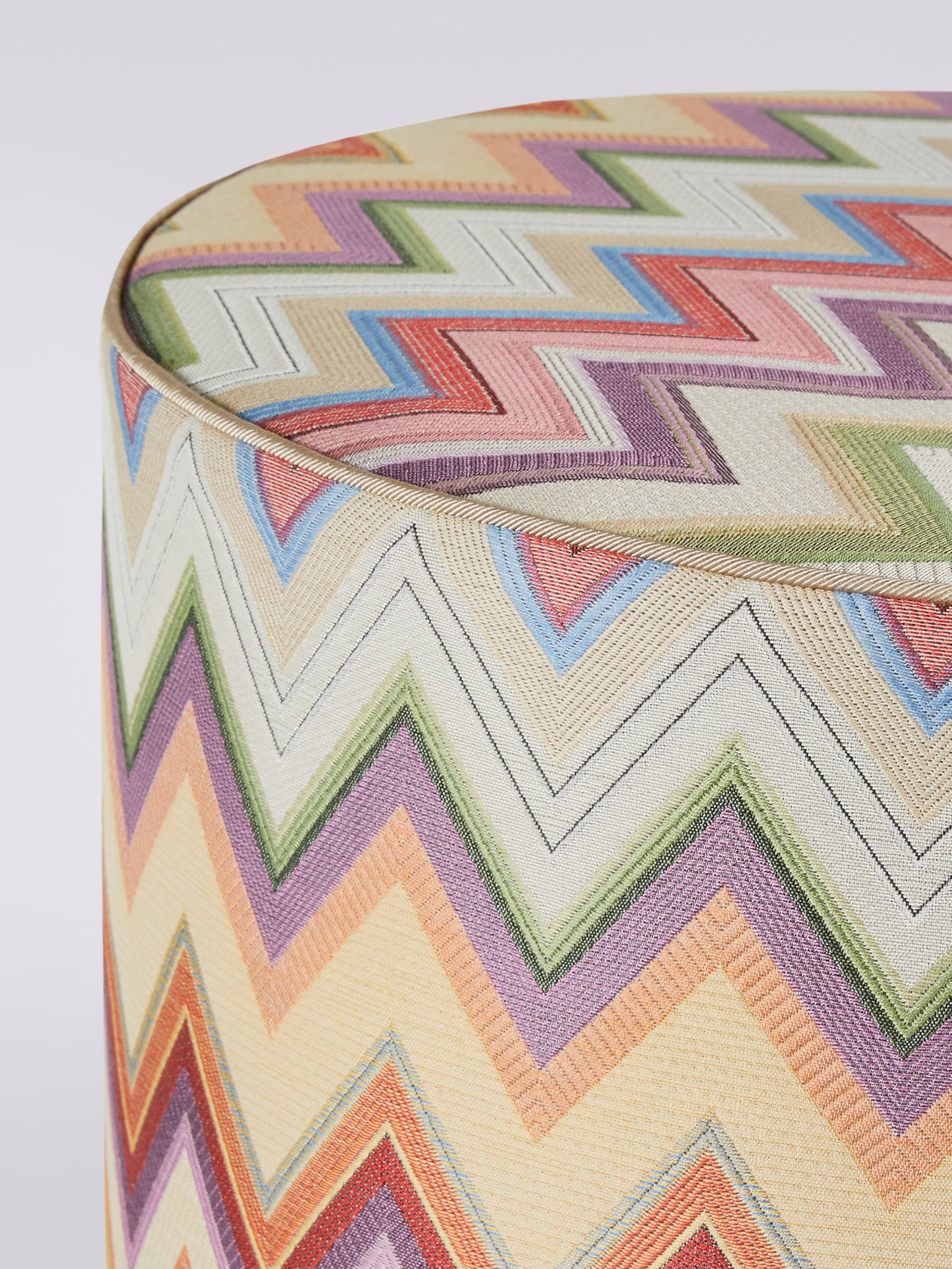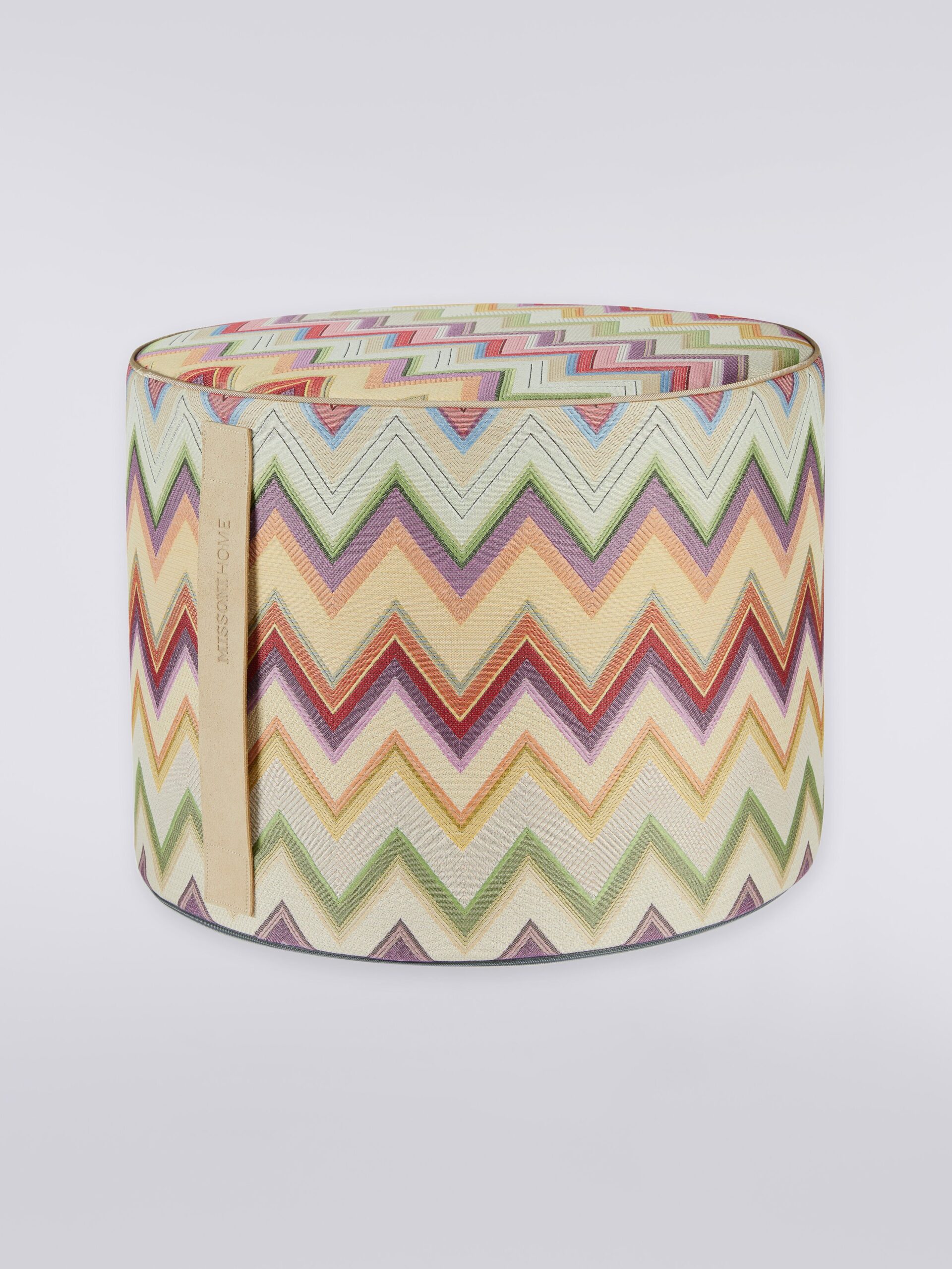 Elegant puff i sylinderform med Missonis Agadir-mønster i varme og livlige fargetoner.