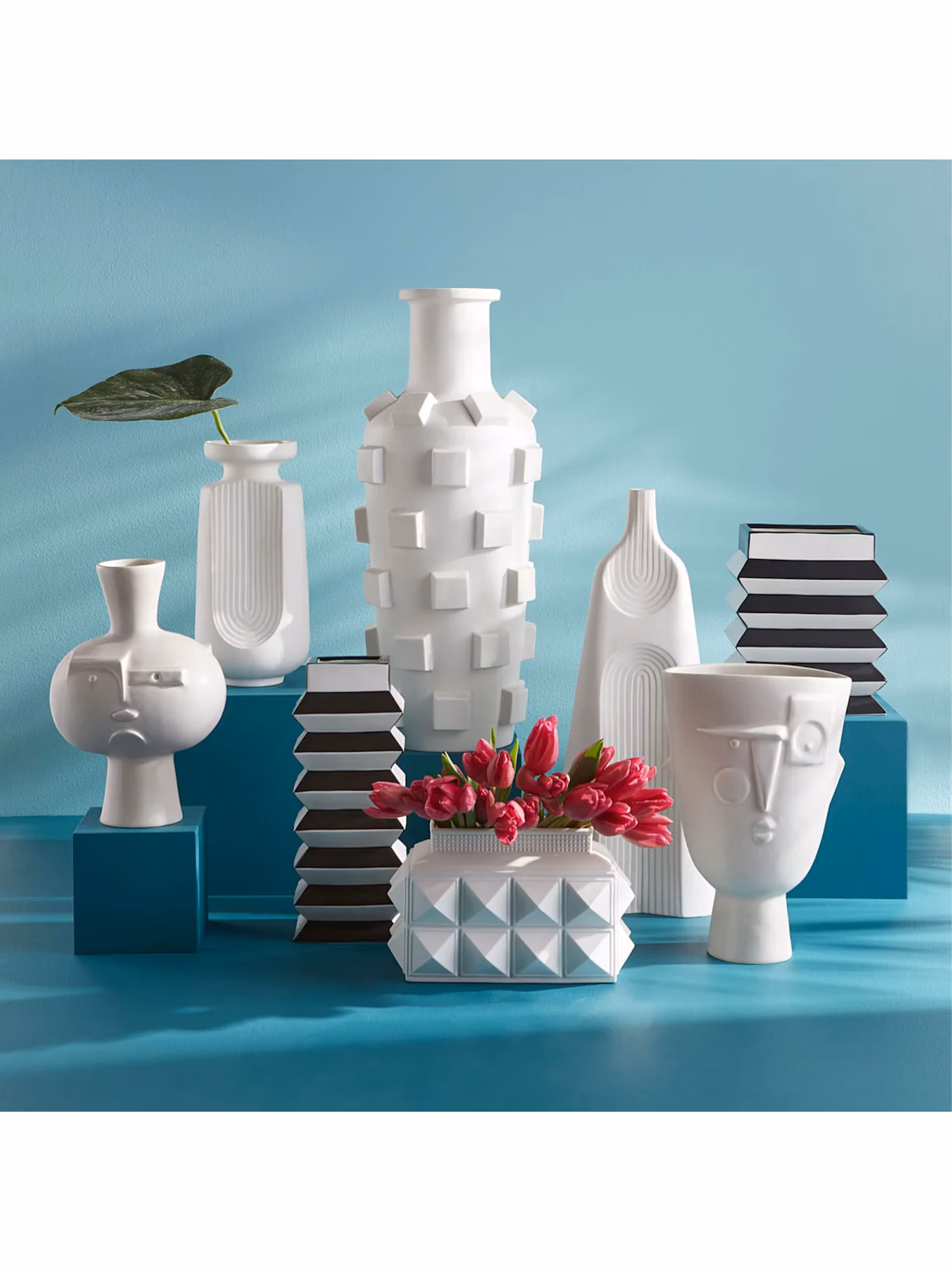 Charade Blocks Vase – White er en imponerende vase fra Jonathan Adler med Brutalist-inspirerte blokker og strukturelle detaljer i høy kvalitet matt porselen. Den uglasserte utsiden gir vekt og karakter, mens den glaserte innsiden gjør den funksjonell for blomster eller dekor. Med diameter på ca. 20 cm og høyde ca. 51 cm blir den et markant blikkfang på bordet eller i en konsoll.