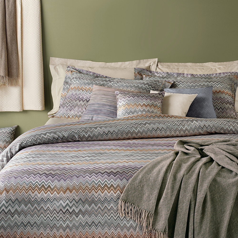 Dynetrekk i bomullssateng med Missonis ikoniske stripemønster i harmoniske, varme fargetoner.