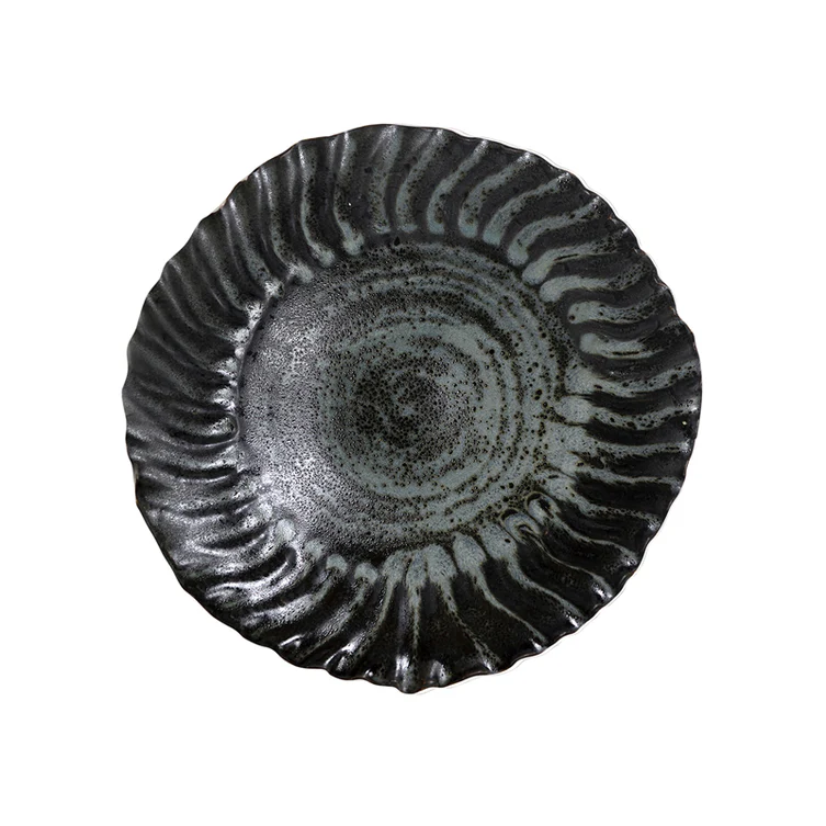 Dyp keramisk tallerken. Charbon-emalje, kontraster av grått og svart, delikat bearbeidet i lag oppå hverandre. Sprayet for hånd