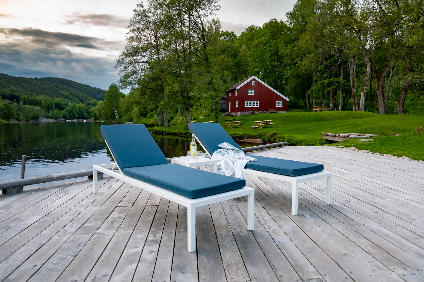 Du kan fint la håndkleet bli igjen inne, for puten er både vannavstøtende og laget av drenerende skum. Skulle det skje et lite uhell, spyler du den bare med hageslangen. Hele solsengen er laget med tanke på at vi faktisk bor i Norge, der det ene øyeblikket kan være sol og det neste regn. Puten tåler å stå ute hele sesongen og tørker hurtig etter et regnskyll.