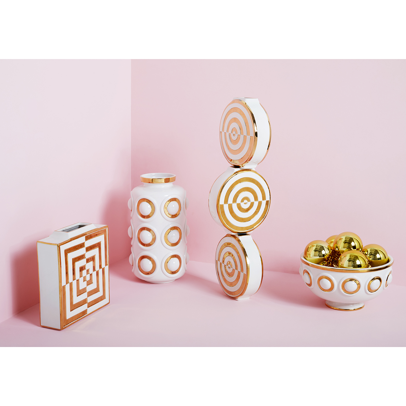 Dekorvase i høyglanset porselen med gulldetaljer og bullseye-design – Jonathan Adler-stil i kompakt form.