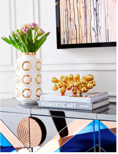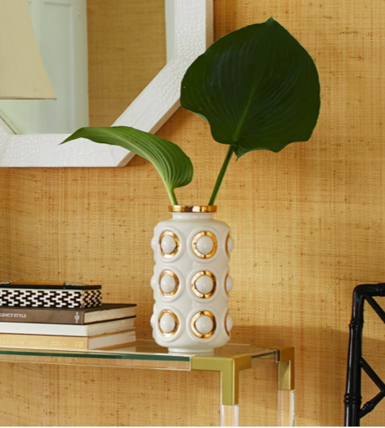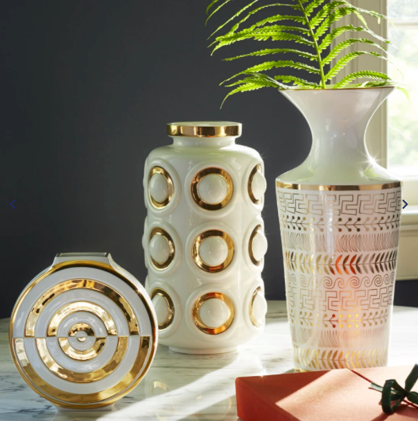 Futura Circles Vase fra Jonathan Adler er en elegant dekorvase i high-fired porselen med ekte gullaksenter. Vasen har et klart og moderne uttrykk med sirkelmotivet som omringer vasen, og høyglanset overflate som reflekterer lys og eleganse. Med sine mål på ca. 32 cm høyde og 18 cm diameter er den stor nok til å imponere både alene og som del av et blomsterarrangement eller dekorgruppering. Et stilfullt valg for deg som ønsker et smykke til bord, peishylla eller entré.