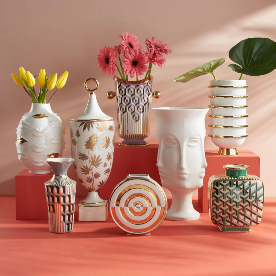 Elegant rund vase i blank porselen med gulldetaljer – glamour fra Jonathan Adler.