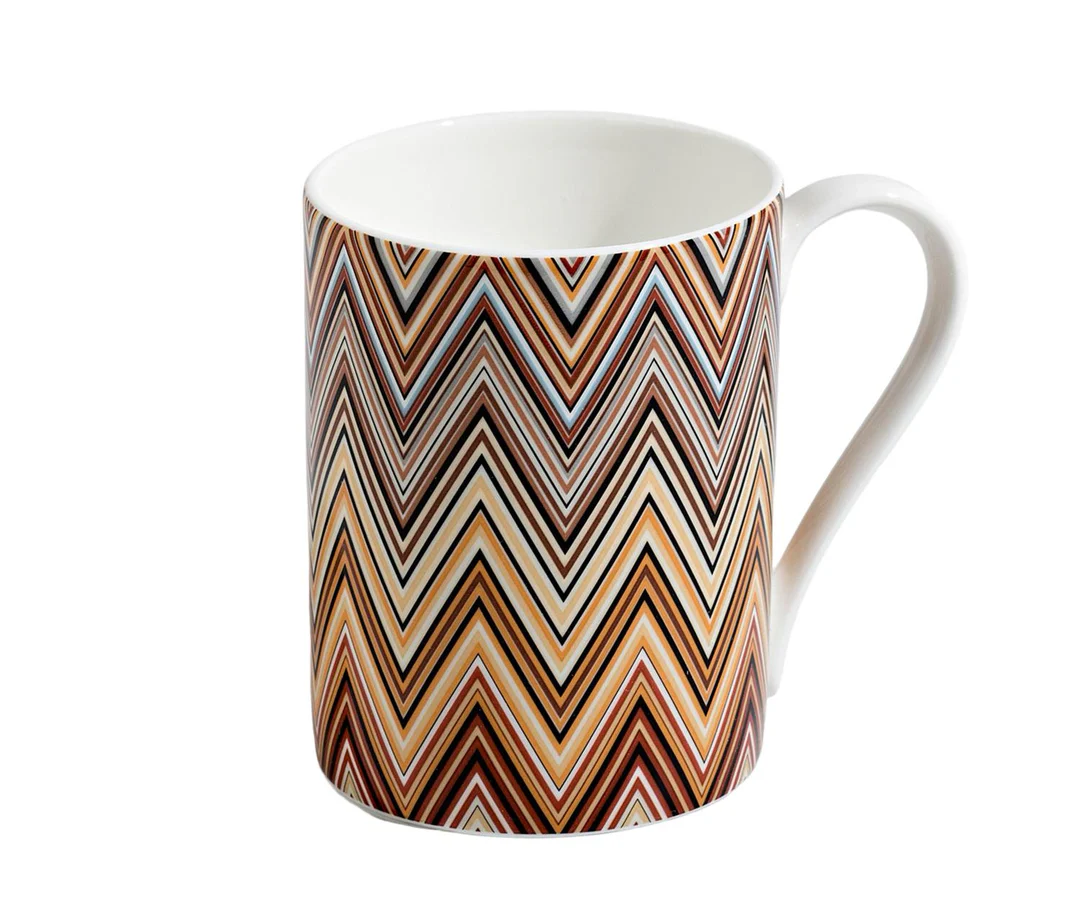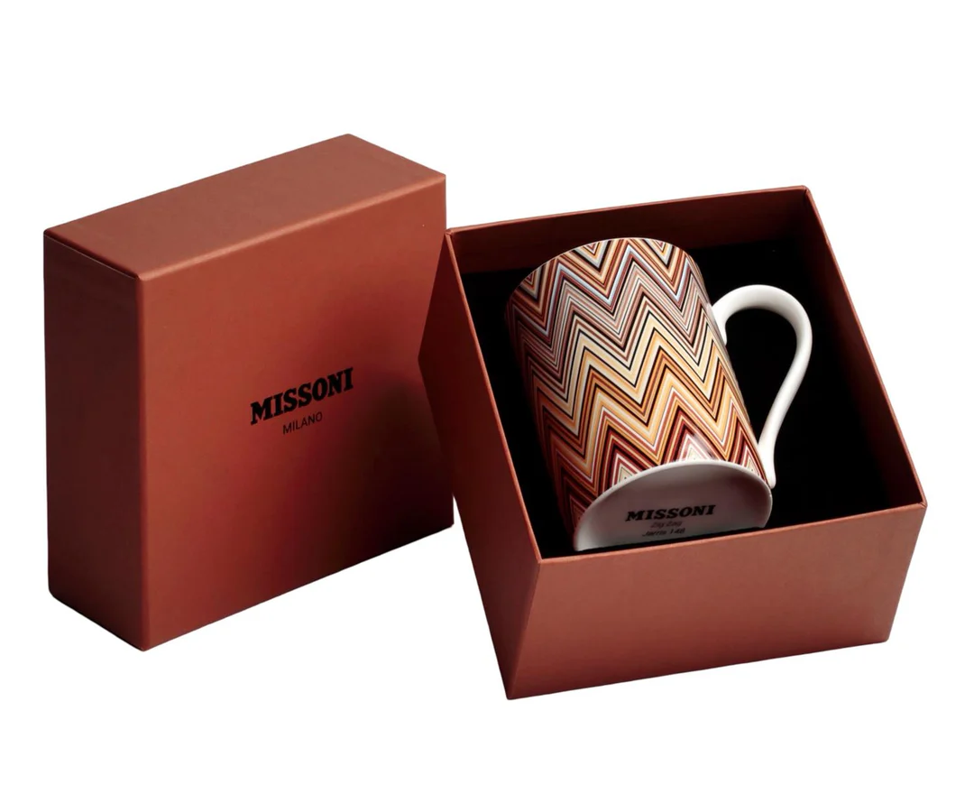Sett med to porselenskrus med Missonis elegante mønster i varme, harmoniske nyanser.