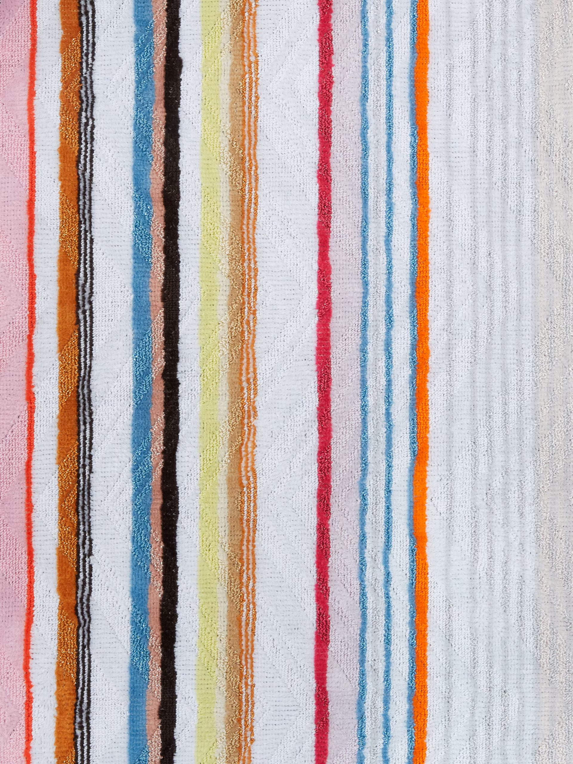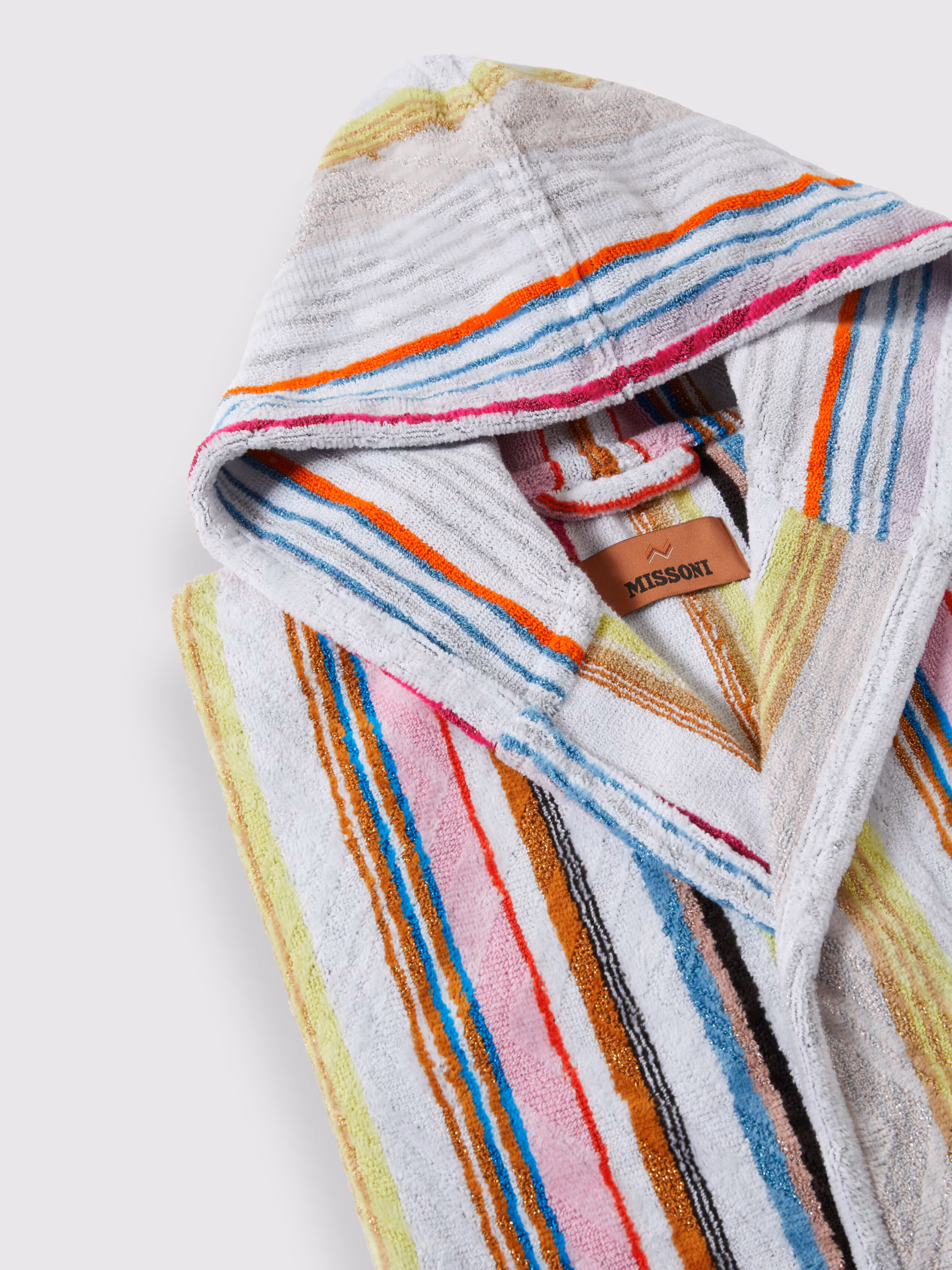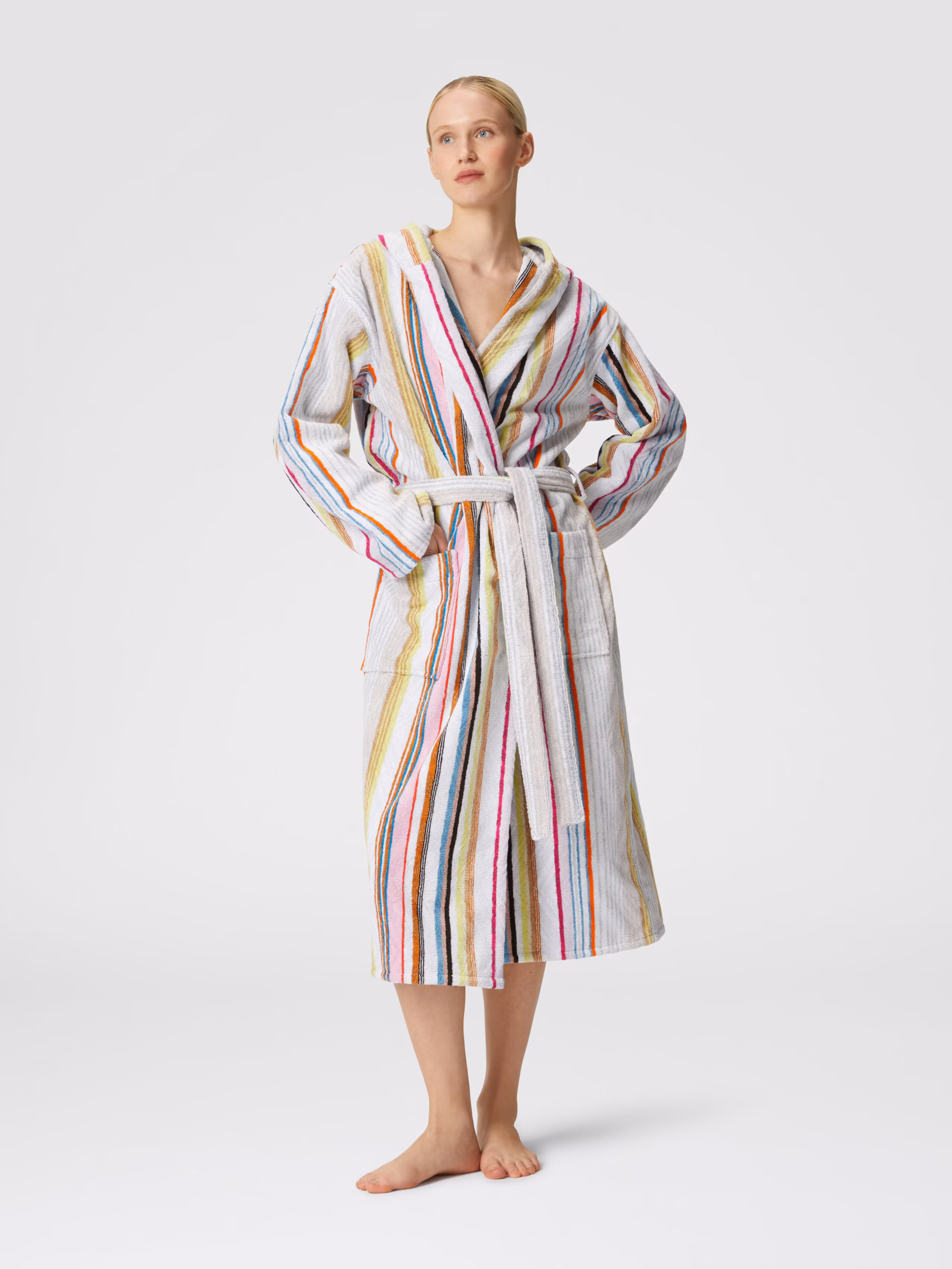 Moonshadow-badekåpen i bomullsfrotté har et raffinert vertikalt stripete mønster, forsterket av subtile lurex-innsatser som gir et snev av glimmer. Fargede vertikale striper arrangert i forskjellige tettheter skaper en dynamisk visuell effekt på den myke chevronfrottéen. Komplett med midjebelte, hette og påsydde lommer, er den det perfekte tilbehøret for å gi din daglige rutine et snev av glamour.