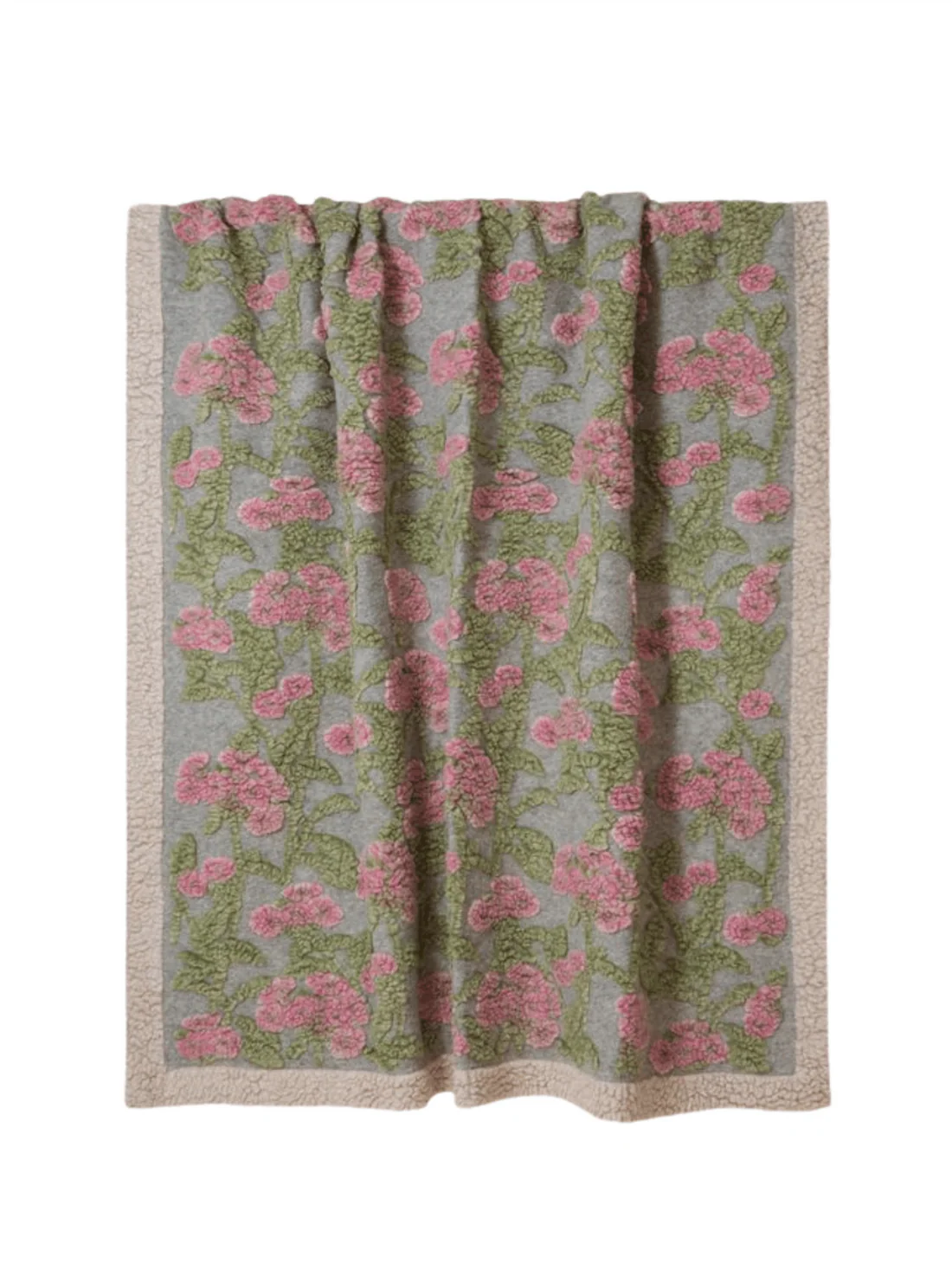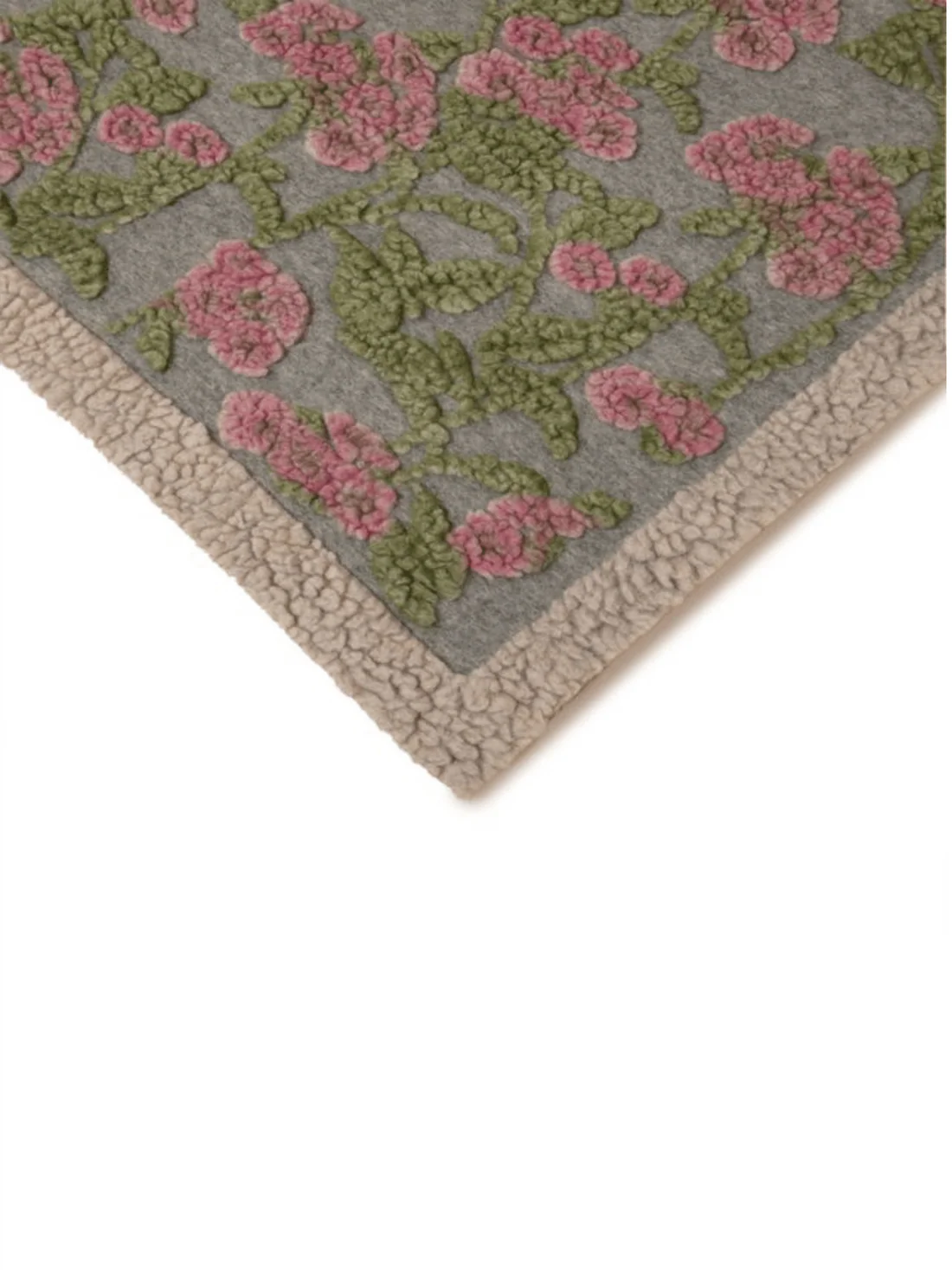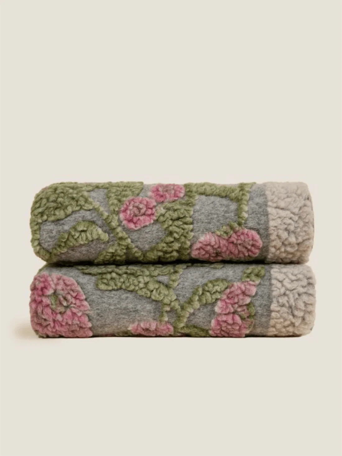 Pledd i kokt ull med mykt blomstermotiv fra Frati Home! Pleddet er i grå tone, med rosa blomster og grønne blader med lys kant.