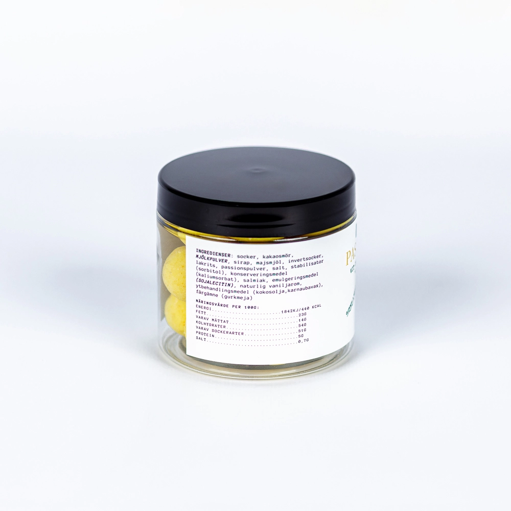 En tropisk forførelse, hvor silkeagtig hvid chokolade smelter sammen med syrlig passionsfrugt og blød lakrids. Frisk, frugtagtig og fyldig. Glutenfri.