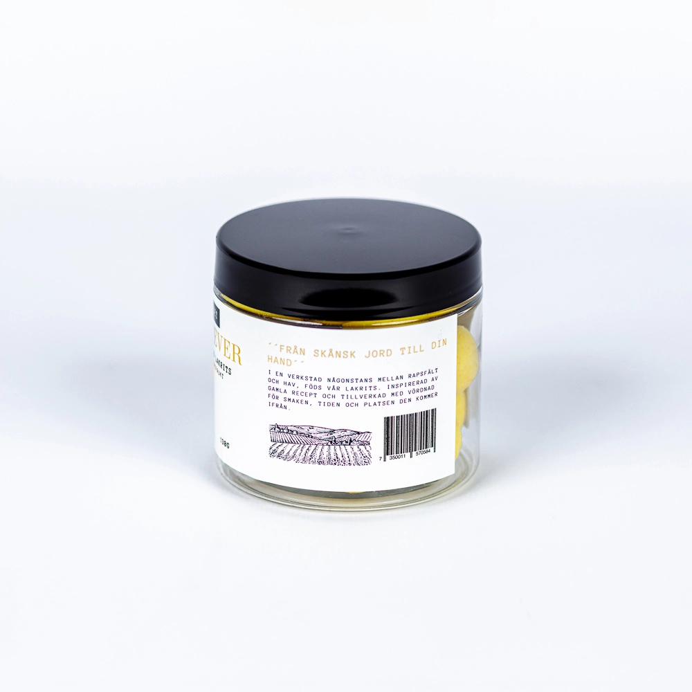 Sukker, kakaosmør, skummetmælkspulver, sirup, majsmel, invertsukker, lakrids (1,7 %), passionsfrugtpulver (1,6 %), salt, stabilisator (E420), konserveringsmiddel (E202), salmiak (ammoniumklorid) (0,3 %), aroma (citt32), emulgator (emulgator (E32), emulgator (E420). overflatebehandlingsmiddel (kokosolie, E903), fargestoff (E100). Allergener: Mælk og soja. Kan inneholde spor af: Mandler og hasselnødder. |