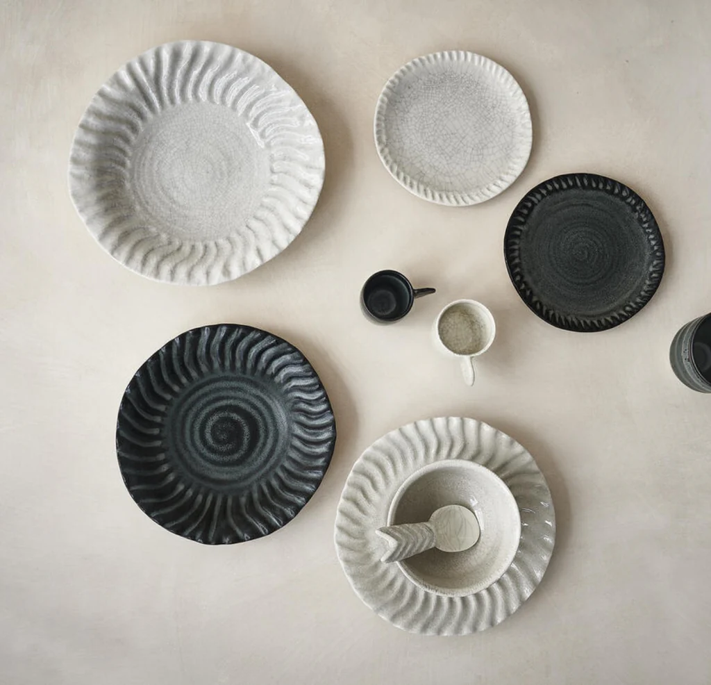 Keramisk desserttallerken. Charbon-emalje, kontraster av grått og svart, delikat bearbeidet i lag oppå hverandre. Sprayet for hånd.