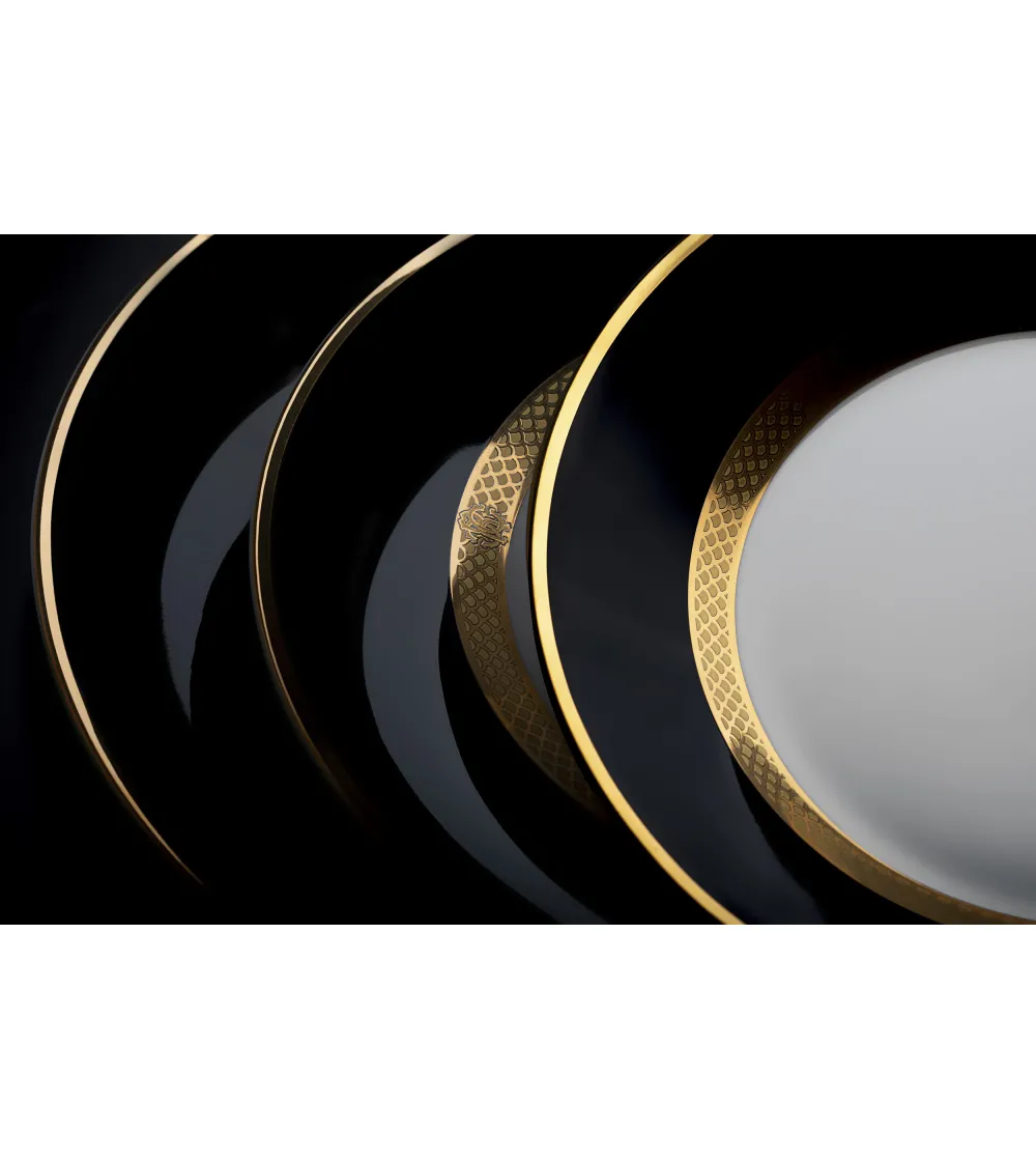 Python Black suppetallerken, 22 cm i diameter, er et vakkert mesterverk for kjøkkenet ditt, laget av Roberto Cavalli fra Bone China, et materiale som er beundret for sin bemerkelsesverdige levetid og eleganse. Denne suppetallerken har en svart og gullkant; hver tallerken er utsmykket med et gullfarget Python-motiv og RC-monogrammet. Python Black er perfekt for moderne, uformell eller klassisk borddekking, og blir et virkelig designtilbehør som unikt fanger gjestenes oppmerksomhet. Det ideelle valget for de som ønsker å tilføre et snev av luksus til kjøkkenet eller spisestuen, og forvandle selve måltidet til en storslått og uforglemmelig begivenhet. Denne suppetallerken er allsidig nok til å brukes både til formelle anledninger og for å forbedre hverdagen, og beviser at eksklusiv design kan gå hånd i hånd med praktisk bruk.