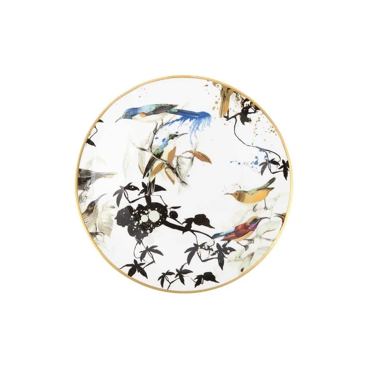 Liten porselens­tallerken med elegant fuglemotiv – italiensk luksus fra Roberto Cavalli Home.