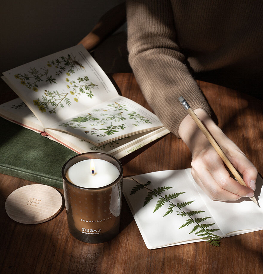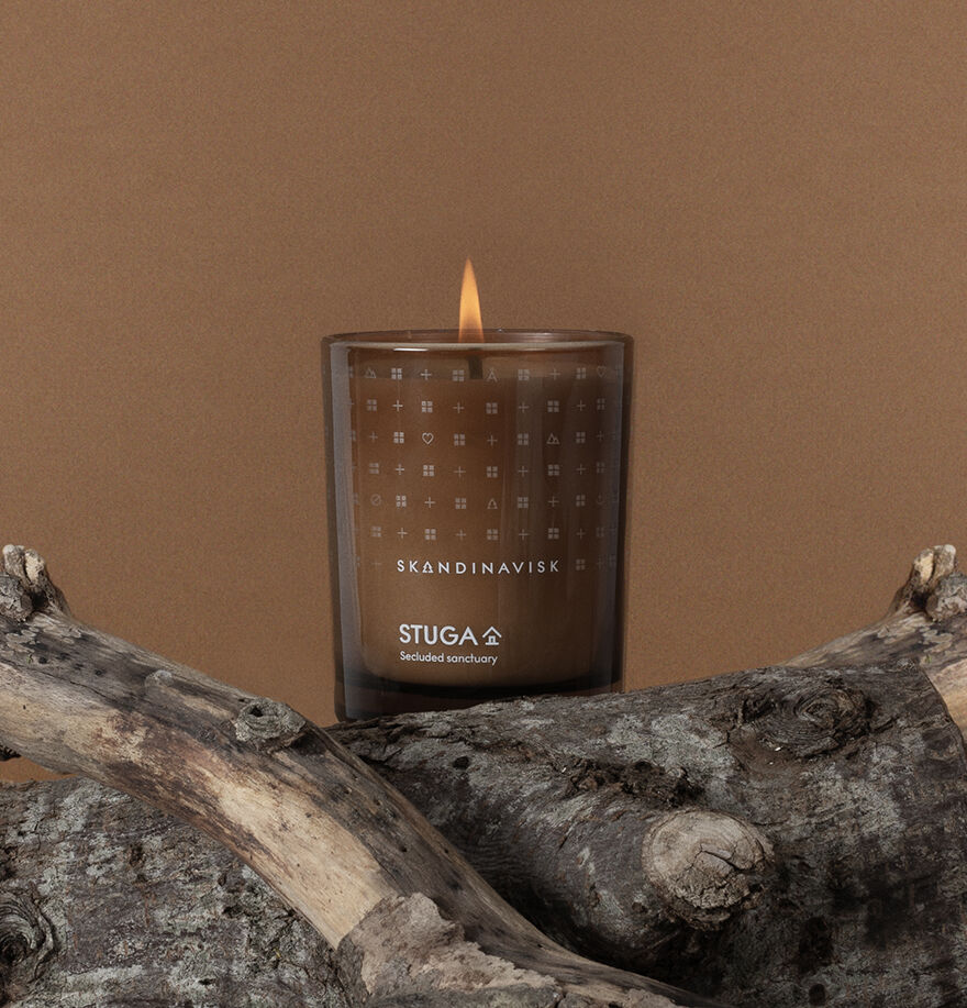 Trekk deg tilbake til en bortgjemt skandinavisk hytte Duftnoter: bjørkenever og skogmose, muskatnøtt og røkelse 200 g svensk rapsvokslys. 50 timer