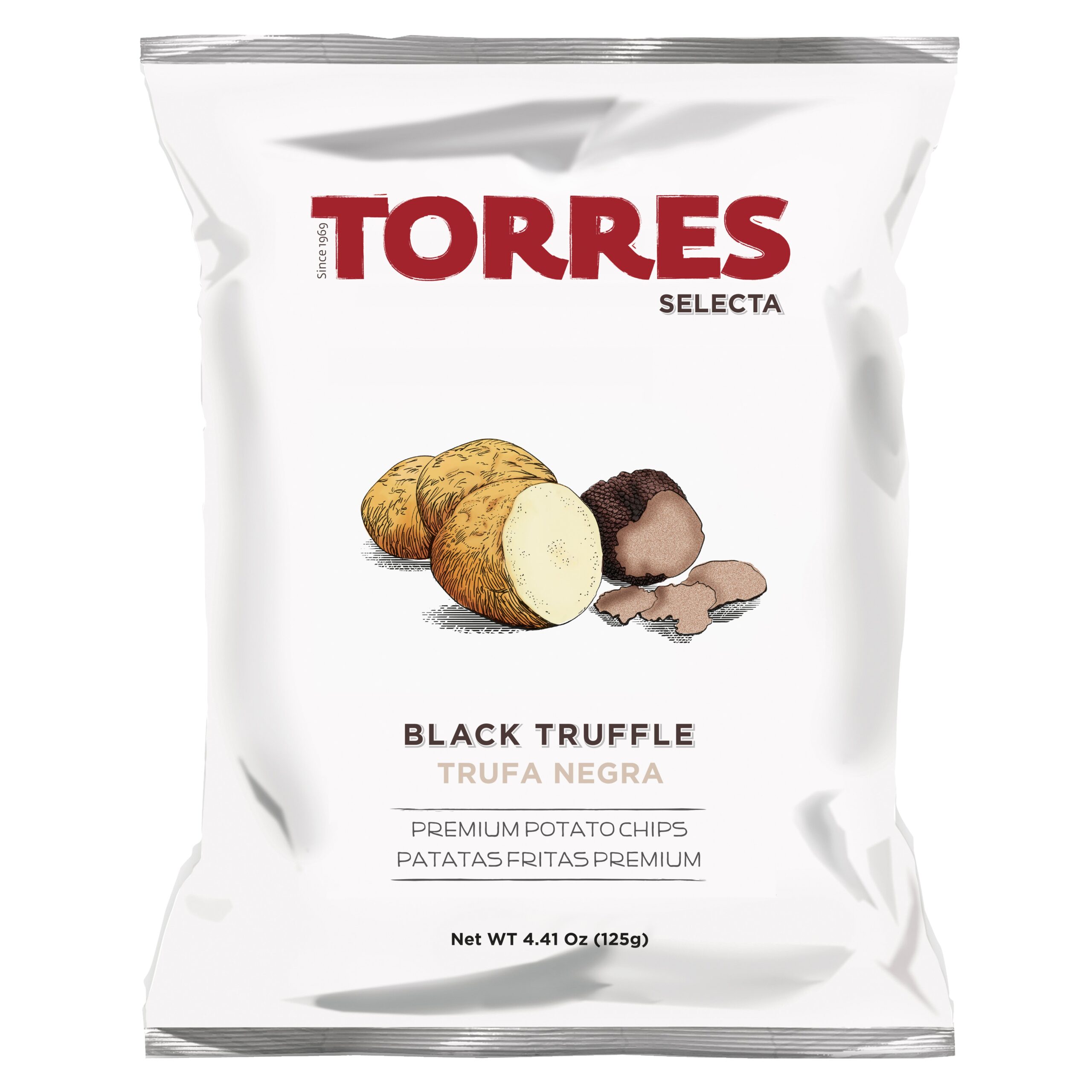 Tynnskårne spanske gourmet potetchips smaksatt med sort sommertrøffel. Herlig sammen med noe musserende!