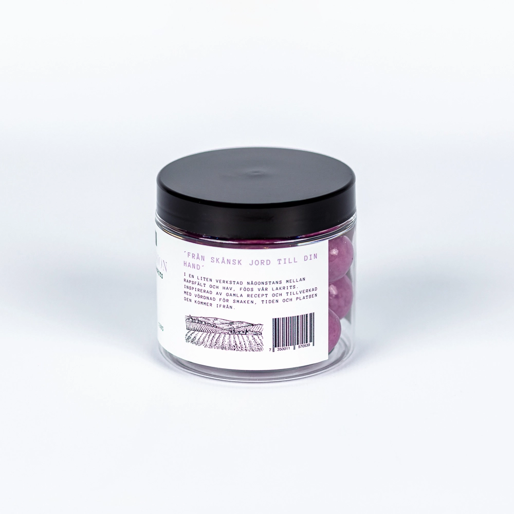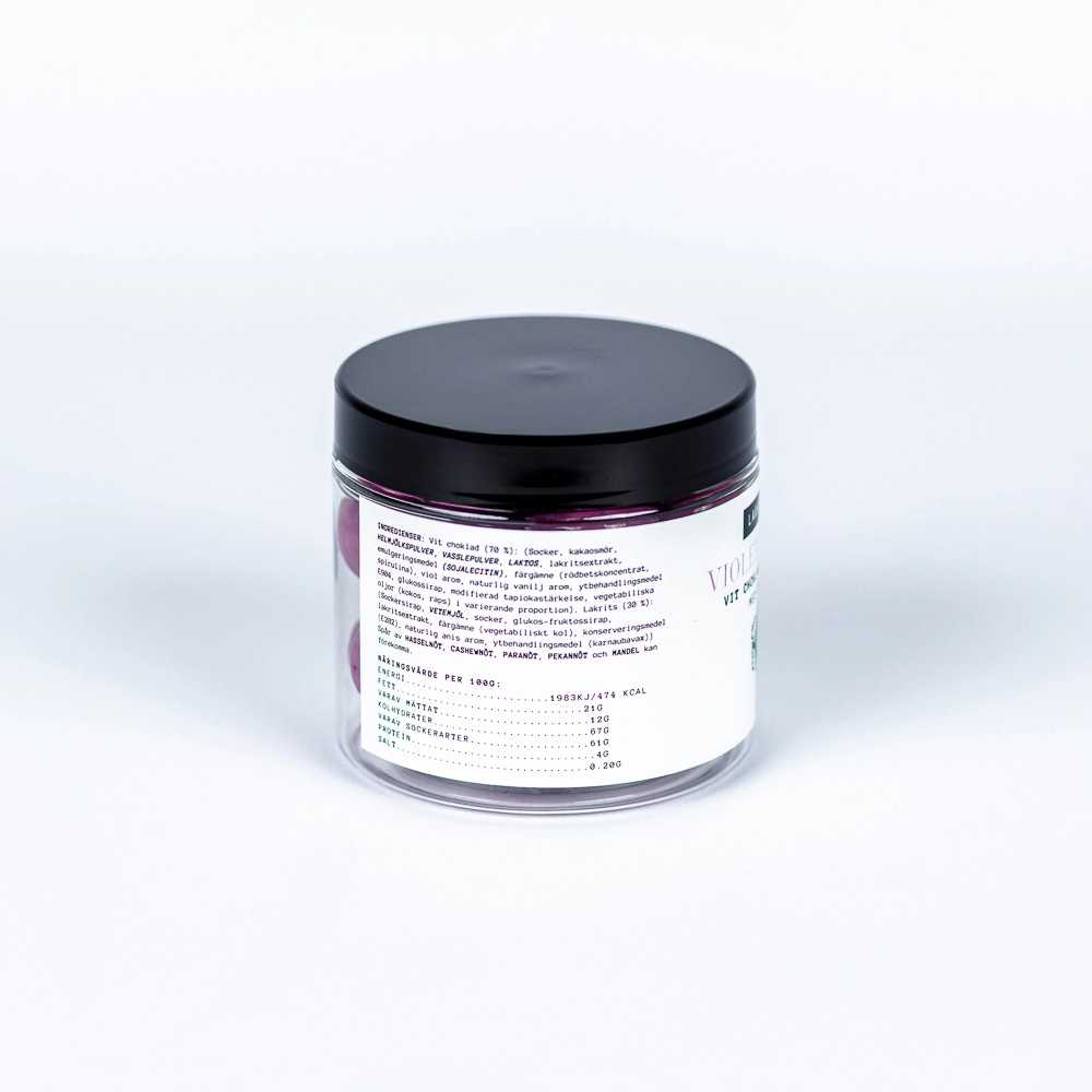 Indholdsdeklaration Hvid chokolade (70%): (Sukker, kakaosmør, SKUMMETMÆLKSPULVER, VALLEPULVER, LAKTOSE, lakridsekstrakt, emulgator (SOJALECITIN), farvestof (rødbedekoncentrat, spirulina), viol aroma, naturlig glukosemiddele aroma94, overflatebehandling. tapiokastivelse, vegetabilske oljer (kokos, raps) i varierende proporsjoner). Lakrids (30%): (sukkersirup, HVEDEMEL, sukker, glukose-fruktosesirup, lakridsekstrakt, farvestof (vegetabilsk kul), konserveringsmiddel (E202), naturlig anis aroma, overflatebehandlingsmiddel (carnaubavoks)). Spor af HASSELNØD, CASHEWNØD, PARANØD, PEKANNØD og MANDLER kan forekomme.